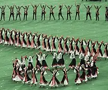 • Children's performance, beginning with a boys' pole horse performance, followed by a girls' doll performance. Gymnastic maneuvers were done by the performance in each part of the segment, which ended with the boys and girls mixed together, forming groups of "troikas", then leaving the scene.
