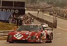 Well behind them was the pack of 956s, led by the two yellow New Man Joest cars. The best time they could put up was a distant 3:26.1 for Johansson (over 2 seconds slower than their times the year before).[39] Next were the lead cars of the RLR-Canon (Palmer), JFR Skoal Bandit (Hobbs) and Kremer (Schuppan) teams. Eighth was the WM (3:30.0 – six seconds and ten places better than they did the previous year), with the other Kremer Porsche 9th and the Nimrod in 10th.[8][14][40] A number of the Porsche teams were finding their new high-downforce nose-cones that set up disturbing fishtailing along the long straits. For those who still had them, some teams reverted to the original low-grip noses. This wasn't an option, however for the new 962s which left their drivers very concerned.[39][13] A further concerning problem struck the Ivey Porsche, when the suspension failed and it lost its front wheel during practice. De Cadenet would lose another wheel in the Porsche Curves on Saturday evening.[15][14] The best of the GTPs was Tullius' Jaguar in 14th (3:35.3) with the March down in 35th (3:50.5). The new 962s were disappointing and off-the-pace with the aerodynamic issues, only qualifying 16th (JFR) and 26th (Henn). The Courage was the fastest of the Cosworth-powered cars in 20th.[14] Top in C2, once again, was the nimble Alba in 22nd (3:41.48) out-qualifying a third of the C1 and GTP cars. Their nearest opposition was the Rondeau in 30th (3:47.5). Among the GTs, it was the GTO-entered Alméras Porsche that was quickest by a sizeable margin, with a 4:02.8 (45th) ahead of the Winther BMW of Group B (46th with a 4:09.9). The GTX Ferrari was just ahead of them in 43rd.[41][14][40]