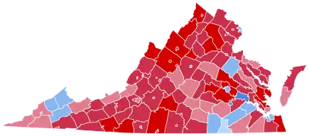 Reagan performed well throughout all of Virginia's regions, relegating Mondale mostly to some largely African-American counties in the east, some highly unionized coal counties in southwest Virginia, and the independent cities of Alexandria, Norfolk, Richmond, and Portsmouth.[1] Particularly noteworthy, however, was Reagan's strong performance in Virginia's large, suburban counties: he got over sixty percent of the vote in Fairfax County, which cast the most votes of any of the state's jurisdictions, and over seventy percent in the independent city of Virginia Beach, Henrico County, and Chesterfield County. He also got over 2/3 of the vote in the emerging exurb of Prince William County. In a noteworthy shift against the state and national trend, however, Mondale flipped Arlington County, making Reagan the first Republican since William Howard Taft in 1908 to win the White House without carrying that county.[2]