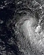 On March 17, the JTWC upgraded Gasitao to the equivalent of a minimal hurricane. On the next day, the MFR upgraded it to tropical cyclone status as the storm slowed and turned to the south and east. The cyclone developed a well-defined eye during this time, surrounded by a powerful central dense overcast. On March 19, the JTWC estimated peak 1 minute winds of 240 km/h (150 mph) while the storm was passing 350 km (220 mi) northeast of Rodrigues. The MFR assessed that Gasitao reached winds of 150 km/h (93 mph) that day before weakening, although the cyclone restrengthened on March 20 to a peak of 170 km/h (110 mph). It accelerated southeastward while gradually weakening.[23][24] On March 23, Gasitao became extratropical,[25] and the remnants dissipated two days later as they were absorbed into the westerlies.[23]