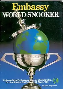 The 1987 World Snooker Championship (also referred to as the 1987 Embassy World Snooker Championship for the purpose of sponsorship) was a professional snooker tournament that took place between 18 April and 4 May 1987 at the Crucible Theatre in Sheffield, England. It was the sixth and final ranking event of the 1986–87 snooker season. The championship was the 1987 edition of the World Snooker Championship, first held in 1927, and had 32 participants. The highest ranked 16 players were awarded a place in the first round draw, whilst a pre-tournament qualification event for 104 professionals was held between 26 March and 4 April at the Preston Guild Hall for the remaining places. The tournament was sponsored by cigarette manufacturer Embassy and had a prize fund of £400,000 with the winner receiving £80,000.