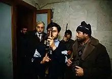 On 24 September, Zviad Gamsakhurdia proclaims a state of emergency.[27] Government then begins a new round of attacks on the press, notably when Russian journalist Albert Kochetkov has his apartment robbed by 15 armed soldiers.[16] Tengiz Kitovani, meanwhile, promises to support the political opposition to Gamsakhurdia and sends a support message to the members of the NDP through journalist Zurab Kodalashvili, who has his equipment confiscated by authorities.[16]