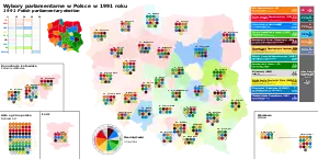 Parliamentary elections were held in Poland on 27 October 1991 to elect deputies to both houses of the National Assembly.[1] The 1991 election was notable on several counts. It was the first parliamentary election to be held since the formation of the Third Republic, the first entirely free and competitive legislative election since the fall of communism, the first completely free legislative election of any sort since 1928. Due to the collapse of the Solidarity political wing, the Solidarity Citizens' Committee, the 1991 election saw deep political fragmentation, with a multitude of new parties and alliances emerging in its wake.[2] Low voting thresholds within individual constituencies, along with a five percent national threshold allocated to a small portion of the Sejm, additionally contributed to party fragmentation.[3] As a result, 29 political parties gained entry into the Sejm and 22 in the Senate, with no party holding a decisive majority. Two months of intense coalition negotiations followed, with Jan Olszewski of the Centre Agreement forming a minority government along with the Christian National Union, remnants of the broader Centre Civic Alliance, and the Peasants' Agreement, with conditional support from Polish People's Party, Solidarity list and other minor parties.[4]