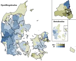 ![]() Results of the referendum Yes: 50–55% 55–60% 60–65% 70%+ No: 50–55% 55–60% 60–65% 65–70% 70%+ | ||||||||||||||||||||||