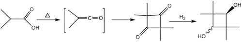 Synthesis of CBDO involves pyrolysis of isobutyric anhydride followed by hydrogenation of the resulting 2,2,4,4-tetramethylcyclobutanedione.[4] This synthesis resembles the method used to produce CBDO today. The first step involves conversion of the isobutyric acid or its anhydride into the ketene. This ketene then dimerizes to form a four-membered ring with two ketone groups.
