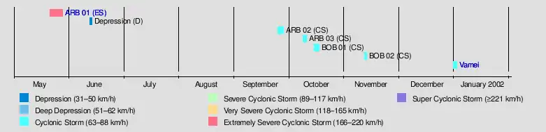 | ARB 02 | September 25–28 | Cyclonic Storm | 65 km/h (40 mph) | 1,000 hPa (29.53 inHg) | None | None | None | |