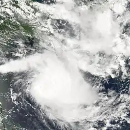 The final and second most intense storm of the season, Monica originated from an area of low pressure off the coast of Papua New Guinea on 16 April.[37] The storm quickly developed into a Category 1 cyclone the next day, at which time it was given the name Monica.[22] Traveling towards the west, the storm intensified into a severe tropical cyclone before making landfall in Far North Queensland, near the Lockhart River, on 19 April. After moving over land, convection associated with the storm quickly became disorganized.[37]