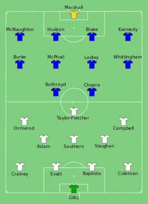Cardiff kicked off the match around 3 p.m. in front of a Wembley Stadium crowd of 82,244.[36][37] They began as the more attacking of the teams, with Peter Whittingham playing a cross into the box where Chopra was able to beat opposition defender Alex Baptiste to the ball, hitting the crossbar with his resulting shot four minutes into the match.[37][38] Five minutes later, Whittingham again played in Chopra, allowing the striker to score past Blackpool goalkeeper Matt Gilks into the bottom corner of the net. Four minutes later Cardiff conceded a free kick on the edge of their penalty area when Stephen McPhail was adjudged by Marriner to have deliberately handled the ball. Adam hit the free kick around the wall and into the net to equalise. After fifteen minutes Cardiff's Bothroyd succumbed to his pre-existing hamstring injury and was substituted,[26] being replaced by loan player Kelvin Etuhu. Blackpool were able to gain control of the game as Cardiff adjusted to the change,[26] with both Stephen Crainey and DJ Campbell shooting wide from outside the penalty area.[30]