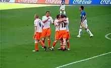 In the second leg, Michael Chopra opened the scoring to double Cardiff's aggregate lead, but an equaliser on the day from Matty Fryatt and an own goal from Cardiff captain Mark Hudson made it level on aggregate at 2–2. Andy King then gave Leicester the lead on aggregate with a goal just after half-time. With just over 20 minutes to play, Cardiff were awarded a penalty, which Whittingham scored to level the aggregate score again at 3–3.[12] With the away goals rule not in effect in the Football League play-offs,[13] the match went to extra time. No further goals were scored in the additional 30 minutes, so the match had to be settled by a penalty shoot-out. Both sides scored each of their first three kicks, before David Marshall saved a Panenka attempt from Leicester's Yann Kermorgant, allowing Mark Kennedy to give Cardiff the lead. Marshall then saved Martyn Waghorn's spot-kick to put Cardiff through to the final.[12]