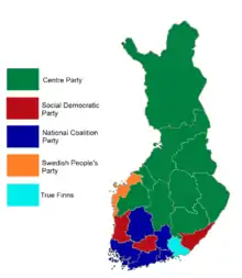 Parliamentary elections were held in Finland on 17 April 2011 after the termination of the previous parliamentary term. Advance voting, which included voting by Finnish expatriates, was held between 6 and 12 April with a turnout of 31.2%.[1][2]
