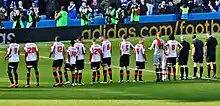 Brentford began the season with a disappointing 1–0 League Cup first round defeat to Walsall and hovered around mid-table in League One, before coming into form in late October 2012.[11] New forward Paul Hayes failed to produce regular goals and was replaced by Huddersfield Town loanee Jimmy Spencer,[12] who in turn was replaced by Marcello Trotta.[13] The Fulham loanee would remain with the Bees for the duration of the season.[14] Inspired by the form of attacking midfielder Harry Forrester,[15] an unbeaten run of 9 wins and four draws in 13 matches between 23 October 2012 and 21 January 2013 firmly established the Bees as challengers for automatic promotion, rising as high as 2nd position in the table.[11] Headway was also made in the FA Cup during the same period, with victories over Boreham Wood, Bradford City and Southend United setting up a fourth round tie versus West London neighbours Chelsea at Griffin Park on 27 January.[11] In a match televised on ITV,[16] Brentford twice took the lead (through a quick-reaction Marcello Trotta finish and a Harry Forrester penalty), but the Premier League club ensured a replay when Fernando Torres pulled the score back to 2–2 with seven minutes remaining.[17] Brentford were comfortably beaten 4–0 at Stamford Bridge in the replay,[18] which was again televised. The match ended on a sour note when Chelsea defender David Luiz's "sickening" late shoulder charge on Bees midfielder Jake Reeves went unpunished and left Reeves concussed.[19]
