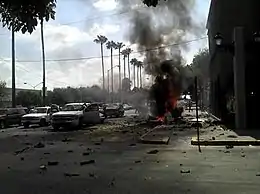 A third car bomb was abandoned on 29 June 2012 in front of the municipal palace at around 11:00 a.m., and exploded just below the office of Benjamín Galván Gómez, the mayor of Nuevo Laredo.[56] Explosives were planted inside a gray Ford Ranger pickup truck, damaging more than ten vehicles that were parked near the car bomb and destroying dozens of windows in its surroundings.[56][57][58] The detonation was heard on both sides of the U.S.-Mexico border.[59] Laredo police said they received calls from several residents reporting an explosion, and dispatched officiers to the international bridges in the Texan city. A plume of smoke was seen from the U.S. side too.[57] In addition, seven people who were near the explosion were injured.[60] The Federal police and the Mexican Army cordoned the crime scene, as paramedics stabilized the bystanders and transported them to the nearest hospital.[61] The Mexican authorities believe this car bomb attack was a form of "expression" by the criminal syndicates who operate in Nuevo Laredo and want to make their presence known.[60] The state of Tamaulipas pledged to intensify the security measures in Nuevo Laredo.[62]