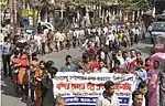 In India, activists of Gairik Bharat burned an effigy of Sheikh Hasina in Silchar, in protest against her failure to protect the Hindu minorities in Bangladesh.[70] The Bharatiya Janata Party, West Bengal unit demands the central government to create pressure on Bangladesh government to protect the Hindus from Islamic extremism.[71] In Rajya Sabha, the upper house of Indian parliament, main opposition Bharatiya Janata Party demanded that an all-party delegation be sent to Bangladesh to assess the "atrocities on Hindus" by Jamaat-e-Islami.[72] On the other hand, Muslim radicals of West Bengal stand for Delwar Hossain Sayeedi and Jamaat-e-Islami with conviction.[73][74] Expressing serious concern on the continued attacks on the Hindus in Bangladesh the South Assam Bengali Hindu Association demanded the intervention of the Indian President Pranab Mukherjee in stopping the atrocities on Hindus in Bangladesh.[75]