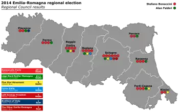 In an election marked by the lowest turnout ever in the Region (37.7%), Stefano Bonaccini, a Democrat, was elected President by defeating several candidates, mainly Alan Fabbri of the Northern League (29.9%) and Giulia Gibertoni of the Five Star Movement (13.3%).