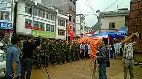 The 2014 Ludian earthquake struck Ludian County, Yunnan, China, with a moment magnitude of 6.1 on 3 August.[10] The earthquake killed at least 617 people, injuring at least 2,400 others.[11][12] As of 5 August 2014, 112 people remain missing.[13] Over 12,000 houses collapsed and 30,000 were damaged.[14] According to the United States Geological Survey, the earthquake occurred 29 km (18 mi) WSW of Zhaotong city at 16:30 local time (08:30 UTC).[15][16][17]