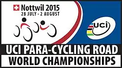 The 2015 UCI Para-cycling Road World Championships were the World Championships for road cycling for athletes with a physical disability. The Championships took place on the roads of Nottwil in Switzerland from 29 July to 2 August 2015.[2] Italy were the most successful team of the competition in number of gold medals won (9), while Germany finished with the greatest total of medals (21).