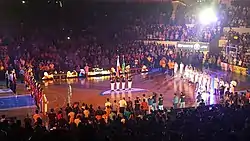 The players of Barangay Ginebra and Meralco during the player introductions before the start of Game 1.
