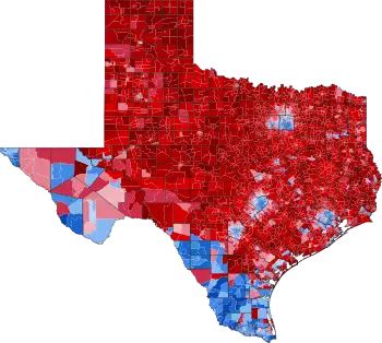 While he continued the Republican 10-cycle winning streak in Texas,[38] Trump's winning margin was down from Mitt Romney's 16% in 2012 to 8.99%, a 7.01% drop, making 2016 the closest Democrats had come to winning Texas since 1996 (though the Democrats also received a smaller percentage of the vote in Texas in this election than in the 2008 presidential election). The surge in Democratic votes can partly be attributed to a growing population of Hispanics/Latinos, Trump's relatively weak performance with college-educated white voters, and the growth of cities and their respective suburbs in the Texas Triangle region, which are heavily populated with both college-educated voters and minorities and thus swung more Democratic compared to 2012.[39] These were Clinton's main sources of votes. She swept the Rio Grande region counties, such as El Paso, Webb, Hidalgo and Cameron as they have sizable Hispanic populations. Clinton scored a 38-point sweep in Travis County, home to the state capital and heavily liberal city of Austin, the best Democratic performance in the county since 1964. She became the first Democrat to break 60% of the vote in Dallas County since 1944. Furthermore, she outperformed Obama in the minority-heavy counties of Bexar (San Antonio) and Harris County (Houston), shifting his slim victories into double-digit leads.[40] In fact, the Presidential vote in Texas' 7th Congressional District, which includes Houston's inner-west suburbs, had the biggest change in margin towards Clinton compared to Obama's 2012 performance outside of Utah, shifting 23 points left.[41] Clinton also won suburban Fort Bend County for the first time since Texas native Lyndon B. Johnson in 1964, which was attributed to the county's large immigrant population and negative perception of Trump by female Republican voters.[42] While Clinton didn't win suburban counties such as Denton County, Williamson County, Collin County, or Hays County, her margin of defeat was much narrower than other Democratic presidential nominees. Trump on the other hand narrowly flipped Jefferson County in East Texas, becoming the first Republican since Richard Nixon in 1972 to win the county.[43] Places that had large numbers of young voters in the state were a stronghold for Clinton as well.[44] Texas Lieutenant Governor Dan Patrick suggested that Trump's relatively small margin of victory could have been largely due to many moderate Republican voters who had supported Romney in 2012 staying home. In an interview conducted the morning after the election, Patrick said in reference to these voters, "Had they turned out, he would've been in the low teens".[45]