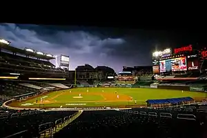 On March 12, 2020, MLB announced that because of the ongoing COVID-19 pandemic, the start of the regular season would be delayed by at least two weeks in addition to the remainder of spring training being canceled.[1] Four days later, it was announced that the start of the season would be pushed back indefinitely due to the recommendation made by the CDC to restrict events of more than 50 people for eight weeks.[2] On June 23, commissioner Rob Manfred unilaterally implemented a 60-game season. Players reported to training camps on July 1 to resume spring training and prepare for a July 23 Opening Day.[3] On September 19, the team suffered its 31st loss, assuring them of finishing the season with a losing record, their first since 2011. On September 22 in game 2 of a doubleheader, the Nationals would get their 4,000th regular season win in franchise history on a walk-off home run by Yadiel Hernández to beat the Phillies 8–7. On September 24, the Nationals were eliminated from playoff contention, making them the 20th defending champion unable to repeat back-to-back titles. The Nationals finished the regular season with a record of 26–34, giving them a fourth place finish in the National League East as a result of the Nationals' 6–4 head-to-head against the Mets, who also finished 26–34 (.433). The Nationals' .433 winning percentage was the lowest for a defending champion since the 1998 Florida Marlins went 54–108 (.333) and the second lowest all time.[4]