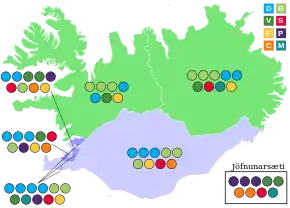 The 63 members of the Althing are elected by open list proportional representation in six multi-member constituencies, with 54 seats distributed between parties at the constituency level with no electoral threshold and 9 leveling seats assigned to party lists at the national level with a threshold of 5 percent required in order to ensure proportionality with the election result.[25] The 54 constituency seats are distributed within each constituency according to the D'Hondt method.[26] Election lists are determined by parties. Voters have the option of marking preferential votes for particular candidates of the party they vote for, which can result in the order of the candidates being altered.[25][27]