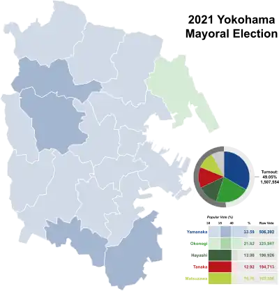 7. "横浜市長選挙候補者別得票数" (PDF). city.yokohama.lg.jp (in Japanese). Retrieved 31 August 2021.