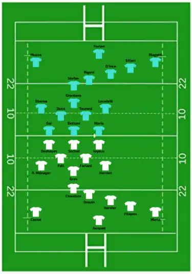 | Try: Fall 17' c Gros 25' c Murie 58' m Boulard 75' c Jacquet 78' c Con: Drouin (2/3) 18', 26' Trémoulière (2/2) 76', 79' Pen: Drouin (2/2) 3', 50' | Report | Pen: Sillari (2/2) 5', 33' |