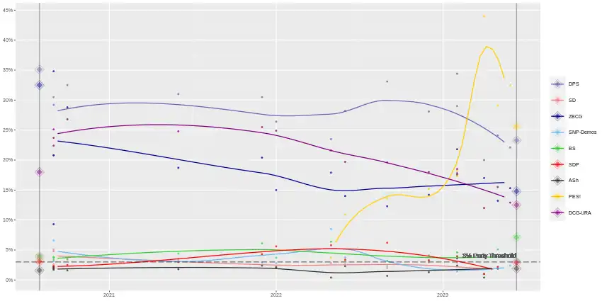 | Feb 2023 | MB/CeDem[lower-alpha 9] | 34.4 | 21.8 | 17.4 | 1.1 | 4.6 | w.DPS | 3.6 | 18.2 | n/a | 11.5 | ||||||||||