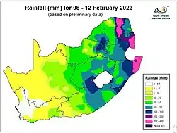 Rainfall (in mm) between 6 and 12 February 2023 in South Africa.