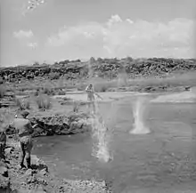 The 2nd New Zealand Division, now including the fully armoured 4th Brigade with three regiments of Sherman tanks,[80] moved to the banks of the Sangro River later in the month and the 6th Brigade was scheduled to mount a night crossing on 21 November. Two companies of the 24th Battalion had crossed the previous night to reconnoitre the opposite bank but the attack was postponed due to bad weather.[81] The brigade eventually crossed, with the 25th Battalion in the centre, on 27 November. As the river was forded on foot, several personnel disrobed for the crossing. Although briefly disturbed during the crossing by a German machinegun, there were no casualties, and the battalion pushed forward and seized its objective, a range of hills over 900 metres (980 yd) beyond the river.[82]