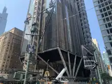 In July 2019, JPMorgan Chase signed an agreement with MTA in which the bank guaranteed that the demolition of 270 Park Avenue would not delay work on East Side Access.[33] That month, scaffolding was wrapped around the tower and podium structure on the Madison Avenue side of the building, the first step in an anticipated 18-month demolition effort.[34] But by late December 2020, only the podium structure had been demolished. Still, parts of the new superstructure were assembled on the Madison Avenue side,[35] and the following month saw the assembly of the new structure's first steel beams.[36] Demolition of the main tower was complete by April 2021; the entire demolition effort wrapped up in June.[37][38]