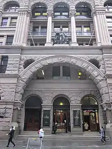 The building is a six-storey structure (with basement) which exhibits many of the distinctive features of the Federation Romanesque style. These include rock-faced masonry, a large and strongly modelled semicircular opening at the ground and first floor level, an arcade above and squat masonry columns with Romanesque capitals at the first and top floor levels. The George Street and Angel Place facades feature arcades heavily modelled in Bowral trachyte and marble, mostly in the form of heavily rusticated rock-faced blocks, erected by the stone masonry firm of Hudson and Loveridge.[1]