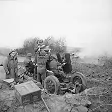 The division next made a long move to the Antwerp area at the end of September, then spent three weeks in the line at Sint-Oedenrode.[44] 51st (H) Division was brought back into the line in October for the operations towards 's-Hertogenbosch to clear the Antwerp area. By the end of the month, after tough fighting, the division had pushed forwards to the River Maas.[45][46][47] The division was then moved to hold 'The Island', the wet low-lying country between Nijmegen and Arnhem, until in mid-December the division was pulled out of the line for rest.[48][49] In December the division was suddenly moved south as part of the response to the German breakthrough in the Ardennes (the Battle of the Bulge), and 51st HD fought its way into the flank of the 'Bulge' in winter conditions.[50][51] When the Luftwaffe launched its Operation Bodenplatte against Allied airfields on 1 January 1945, GHQ AA Troops for 21st Army Group reported that '40 mm LAA had the time of its life' shooting down large numbers of raiders.[52]