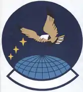 - ↑ Blazon: Azure, a demi-globe issuant from base Celeste, gridlined Azure below an eagle volant proper above in dexter base three mullets of four in bend sinister Or, all within a diminished border of the third. Haulman Factsheet, 4 Space Control Squadron.