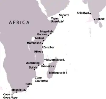 One of the squadrons of the armada, under António de Saldanha, missed the crossing to India, and ended up spending the year preying along the East African coast. Captains of this squadron made several significant discoveries - such as Table Bay (South Africa) and, more importantly, the strategic island of Socotra (near the Gulf of Aden). They also exacted tribute from Zanzibar and Barawa.