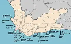 Again, by poor piloting, Saldanha miscalculated his Cape crossing, and ended up making landfall just north of the Cape of Good Hope. To check if the cape had been surpassed, Saldanha anchored in the hitherto unknown Table Bay, and went ashore. He is said to have climbed Table Mountain and observed Cape Point and the vast expanse of False Bay beneath it.[23] Saldanha thus became the first European to set foot in what is to become modern Cape Town.[24] During this landing, there was an apparent skirmish with local Khoikhoi, in which Saldanha got slightly wounded.