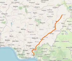 The A4 highway starts at the city of Calabar in Cross River State, positioned in the southern part of the country.[2] The A4 then travels northwards, running parallel to the Nigerian-Cameroonian border.[3]
