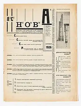 The association was started in 1923 by Nikolai Ladovsky,[1] a teacher at VKhUTEMAS and member of INKhUK, along with other avant-garde architects such as Vladimir Krinsky and Viktor Balikhin. Ladovsky's teaching, although definitively Modernist was nevertheless more 'intuitive' than Functionalist, and was partly based on Gestalt psychology. In 1919 Ladovsky defined architectural rationalism as 'the economy of psychic energy in the perception of spatial and functional aspects of a building', as opposed to a 'technical rationalism'.[2] The group's researches were particularly influenced by the work of Hugo Münsterberg, and Ladovsky built a psychotechnical laboratory in 1926 based on Münsterberg's theory of industrial psychology.[3] In general the group concentrated on creating 'psycho-organisational' effects (as Ladovsky put it) with architecture: a sculptural rather than functional approach, leading to accusations of 'formalism' by the nascent OSA Group. ASNOVA and OSA engaged in polemics over terminology and the claim to 'constructivism'.[4]