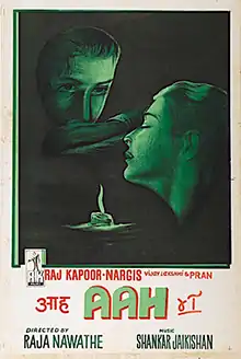 Aah is a 1953 black and white Bollywood romantic drama film starring Raj Kapoor and Nargis in lead roles. The film was produced by Raj Kapoor and directed by Raja Nawathe. This was Nawathe's first independent directorial venture. He had previously worked as assistant director to Raj Kapoor in Aag (1948), Barsaat (1949) and Awaara (1951).
