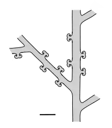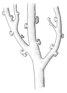 Stems (axes) were bare of leaves, spines or other protrusions, and were between 1.5 and 5 mm in diameter. Branching was 'pseudomonopodial', i.e. resulted in a 'main' stem and a lateral branch. There were up to four orders of branching; the branches were borne in two rows on opposite sides of the stem, producing a relatively two-dimensional structure. All orders of branches appear to have borne distinctive short branches which typically divided only once, the final sections having tips which curved away from each other and back towards the stem which bore them. Meyer-Berthaud and Gerrienne were unable to decide whether these short branches were generally capable of further growth or had ceased to grow and were adapted for some particular function.[1]