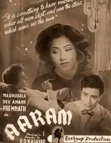 Aaram (lit.'Comfort') is a 1951 Indian Hindi-language film directed by D. D. Kashyap and starring Dev Anand, Madhubala, Prem Nath and Talat Mahmood.[1][2][3] While the film was not a major commercial success,[4] it earned positive reviews from critics for the performances of Madhubala and Anand and the music composed by Anil Biswas.[5]