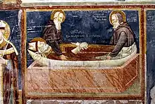 Along the southern flank of the cloister is a door through which one can enter the so-called sacellum (or oratory) of St. Benedict. It is a small, square room divided into three small naves of equal size, covered by nine rib vaults supported by four supports largely made through reused materials dating from very different eras.[76][80] Among these, noteworthy are a sixth-century pulvino in Byzantine style and a Roman cippus placed in a wall pillar. The walls have a 14th-century yellow, red, and green square decoration, while there is a fragment of a fresco on the north wall that is not easily readable.[79]