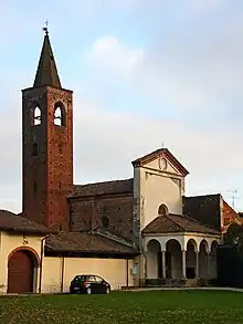 Against the southern side of the portico of the facade, is a building, perhaps a part of the ancient monastery. Beside the church, there are the ruins of the cloister, a brick open gallery with wooden architraves and with a 14th-century Gothic window decorated with rural motives. In the interior, on the right wall, are three frescoes (1410) painted by Giovanni da Milano depicting St Anthony Abbott, the Baptism of Jesus, and an Enthroned Virgin with Donor and Saints Albin, Jacob, and Augustine. Another fresco, by an unknown 15th-century painter depicts St Laurentius with the symbol of his martyrdom in his hand. Next to this fresco are graffiti carved in the bricks by the pilgrims over the ages: the most ancient is from the year 1100. Another anonymous fresco is on the left part of the presbytery and represents Virgin with Child and Saints.[4][5]