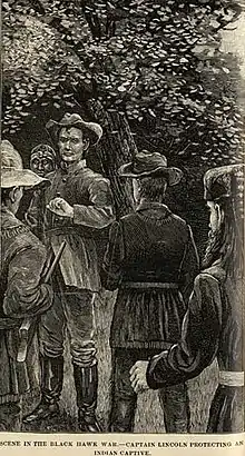 One popularly repeated[35][36] story from Lincoln's Black Hawk War service illustrates Lincoln's qualities of honesty, and courageous, competent leadership. It involves a Potawotami who wandered into Captain Lincoln's camp. Lincoln's men assumed him a spy and wanted to kill him. The story goes that Lincoln threw himself between the Native American and the men's muskets, knocking their weapons upward and protecting the Potawotami. The militia men backed down after a few heated seconds.[37]