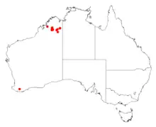 It is native to an area in the Kimberley region of Western Australia where it is found in arid barren quartzite ranges[1] or on granite or sandstone slopes as a part of open Eucalyptus brevifolia woodland communities.[2] Early collections were made around Halls Creek and around the Ord River.[2]