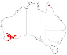 It is native to an area in the Wheatbelt and Goldfields-Esperance regions of Western Australia where it is commonly situated on undulating plains growing sandy or clay-loam soils.[1] It has a scattered distribution from around Cadoux in the north west down to around Dunn Swamp about 100 km (62 mi) north of Raventhorpe in the south east.[2]