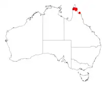 It is found on the Cape York Peninsula of Queensland from around Weipa in the west to around Bowden and the Pascoe and Wenlock Rivers in the east. It is often situated on shell mounds or along sandy river or creek banks as a part of fringing woodland communities along with species of Eucalyptus, Melaleuca, Leptospermum and other species of Acacia.[2]