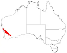 It is native to an area in the Mid West and Wheatbelt regions of Western Australia where it is found on sandplains and lateritic hills and rises growing in gravelly sandy or loamy soils.[1] The disjunct distribution is from around Geraldton in the north west down to around Hyden in the south east where it is often part of shrubland or Eucalyptus woodland communities.[2]