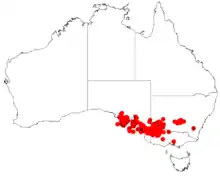 The bulk of the population of the shrub is found throughout south eastern Australia from the Eyre Peninsula near Widunna in the west through to Mallee Cliffs National Park in New South Wales to the north east and Gunbower in Victoria in the south east where it grows in a variety of soil types and vegetation communities.[1] It is often found in sandy to loamy soils in mallee country.[2]