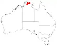 It is endemic to the a small area of the Northern Territory where it has a limited distribution around Gunbalanya (formerly Oenpelli Mission) where it is commonly situated on top of or at the base of sandstone escarpments growing in skeletal sandy soils.[2]