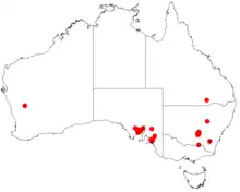 It has a disjunct distribution parts of South Australia and New South Wales .[3] In South Australia it is found in a limited area on the Eyre Peninsula and in the Murray region where it is usually a part of open scrub-land communities and is often associated with Eucalyptus socialis and Eucalyptus gracilis and is found growing in grey-brown calcareous loamy and hard alkaline red duplex soils.[2]